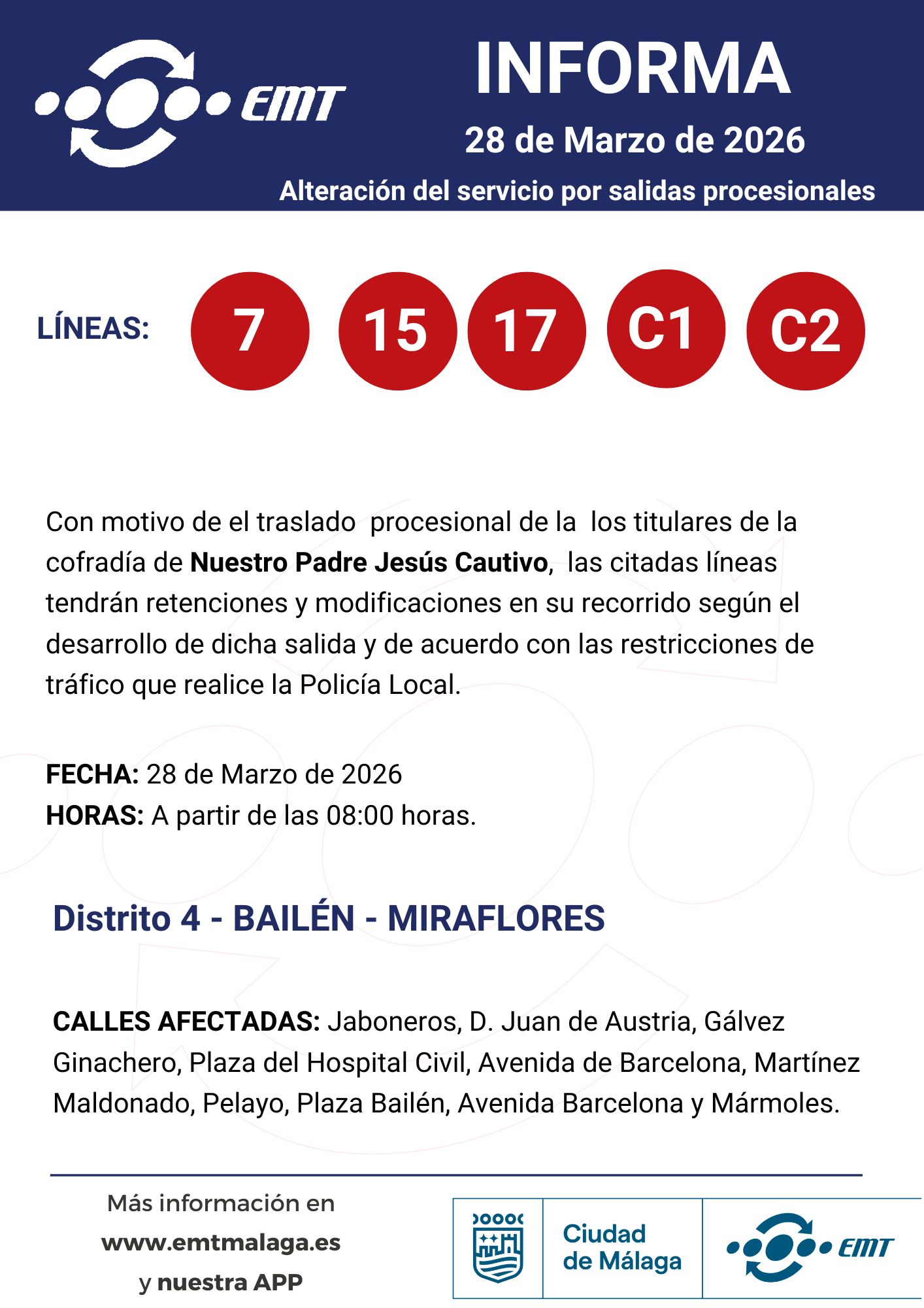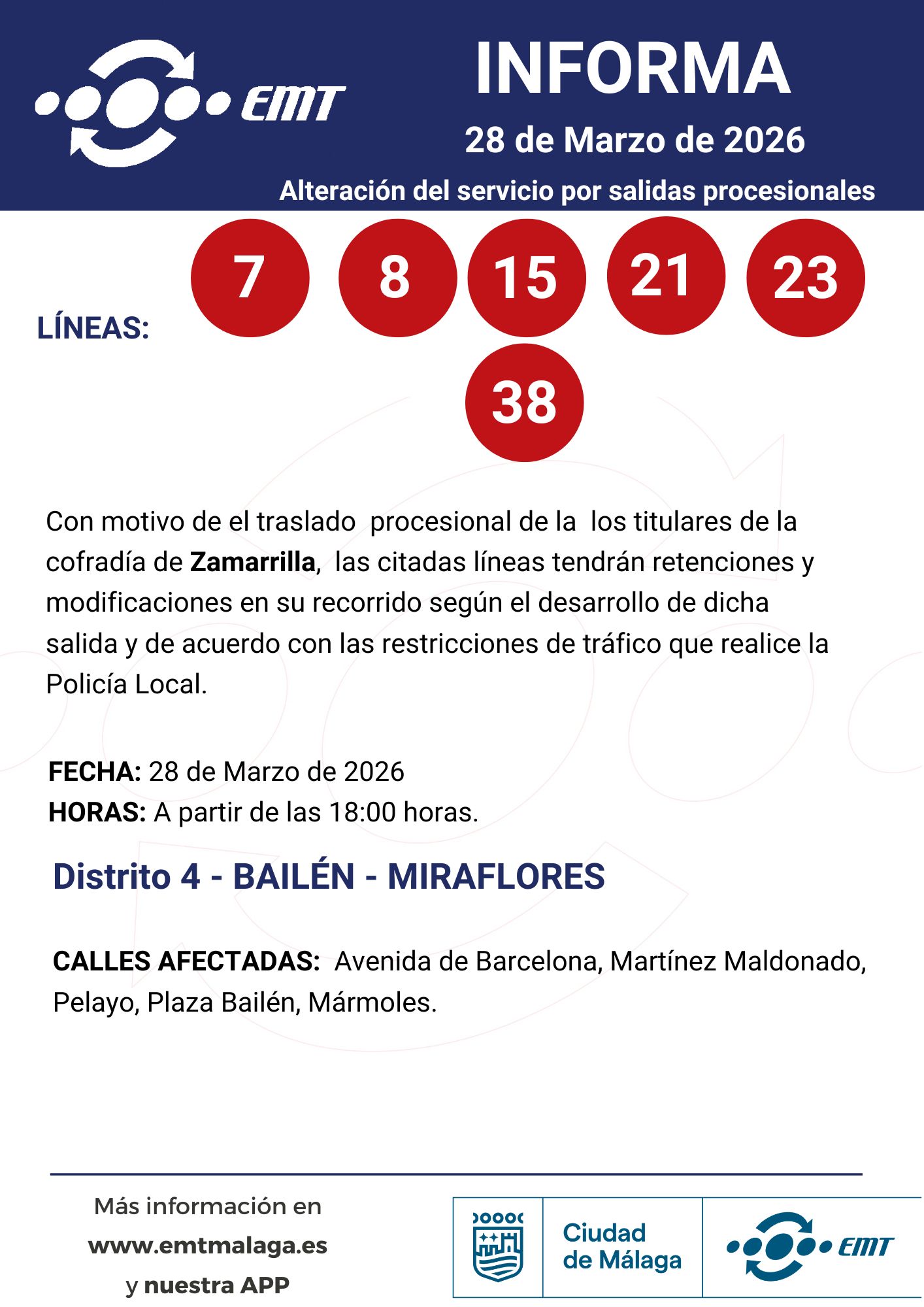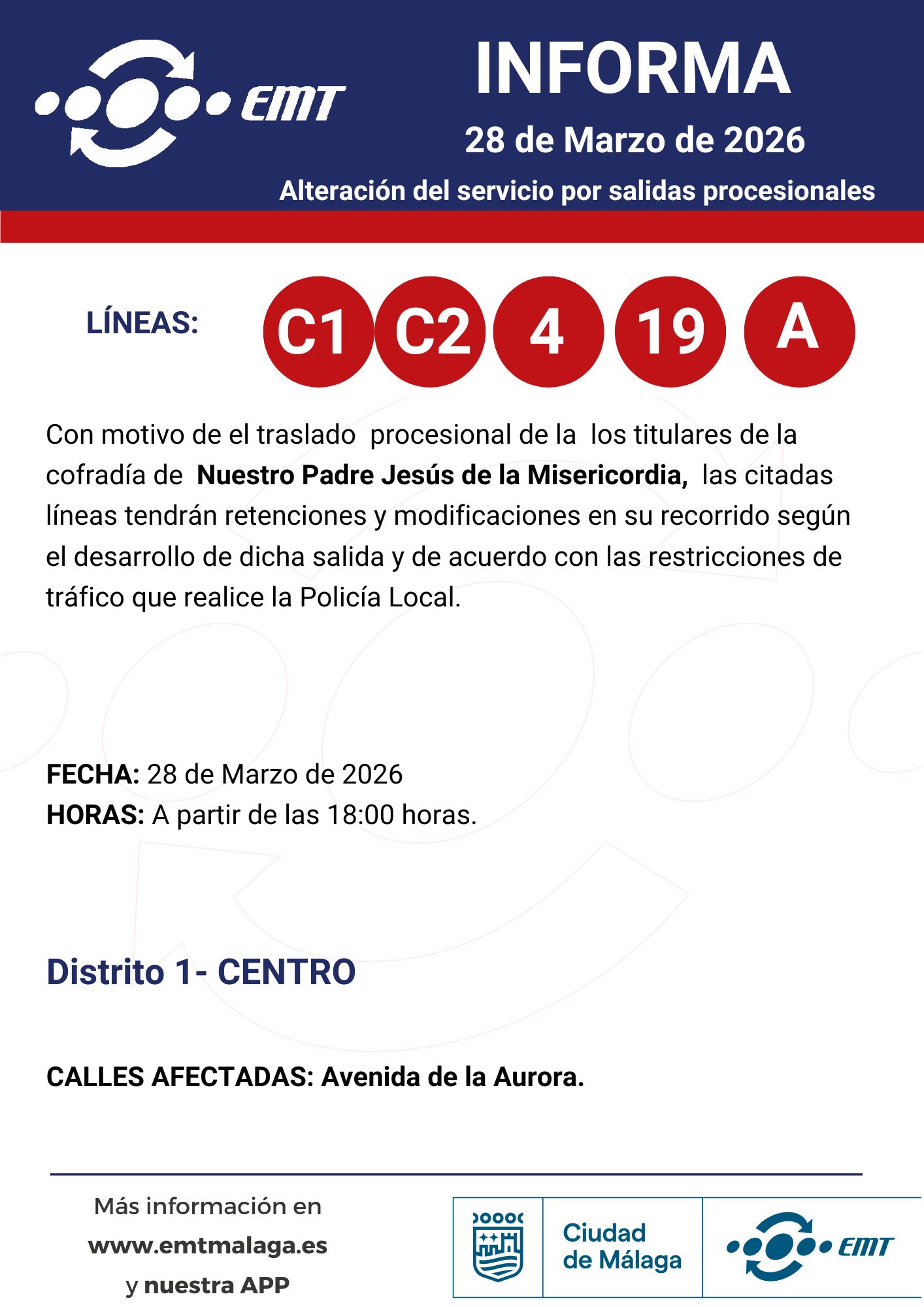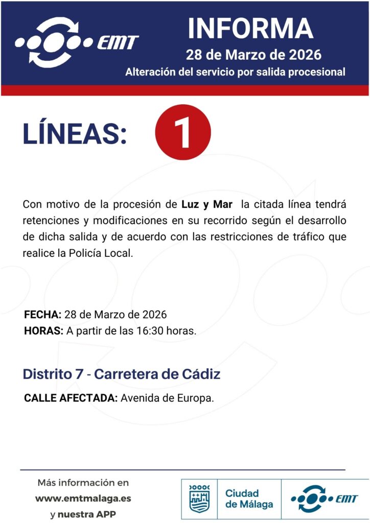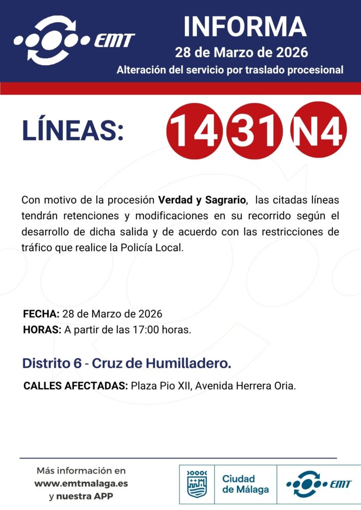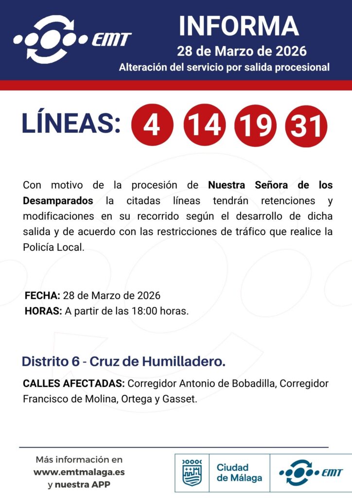28 de marzo. Alteraciones en horarios y recorridos por traslados y procesiones 24/03/2026 EMT Alteraciones, Semana Santa, Uncategorized Por motivo de traslados y procesiones en diferentes barrios de Málaga, algunas de nuestras líneas podrán experimentar alteraciones en horarios y recorridos.