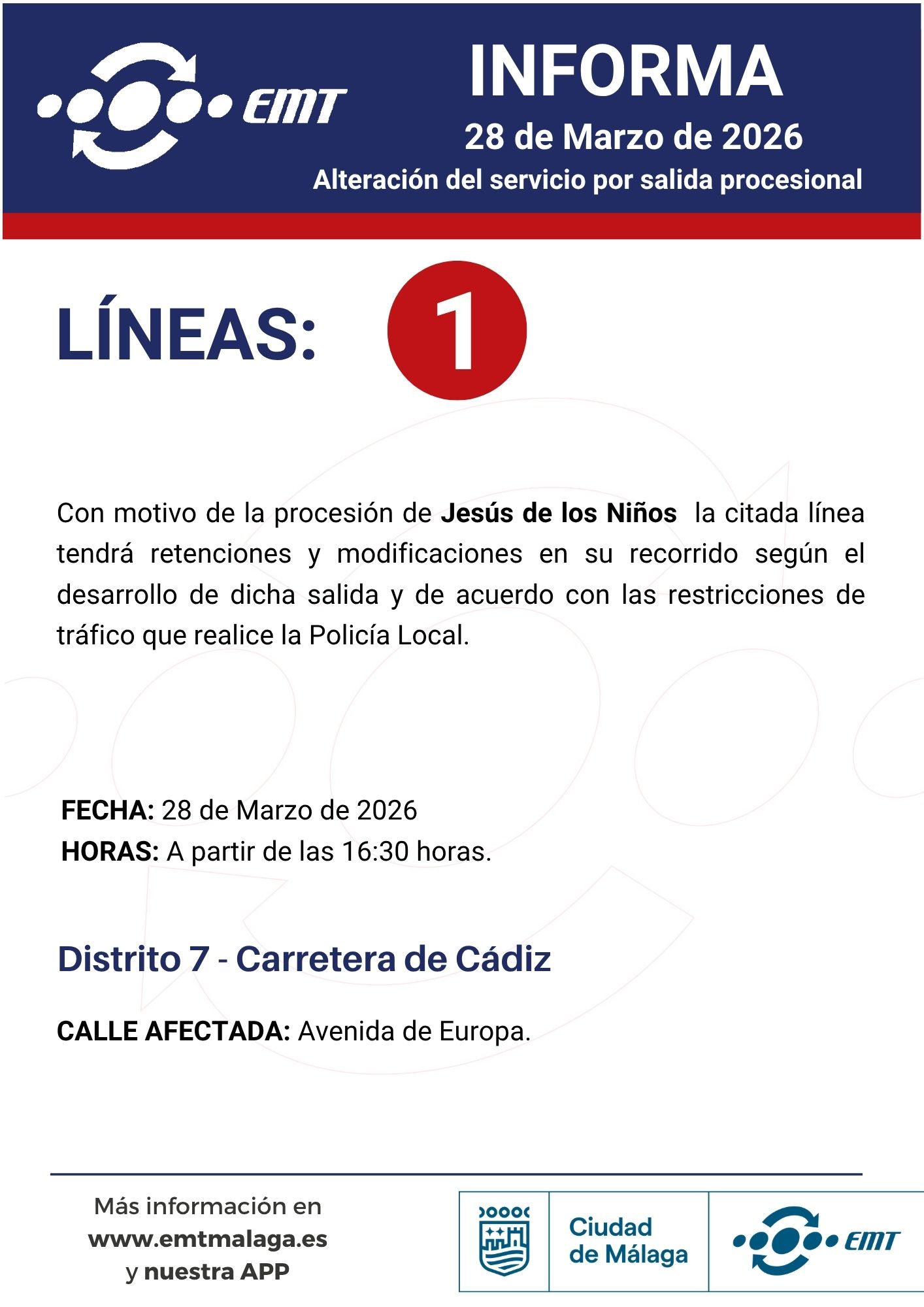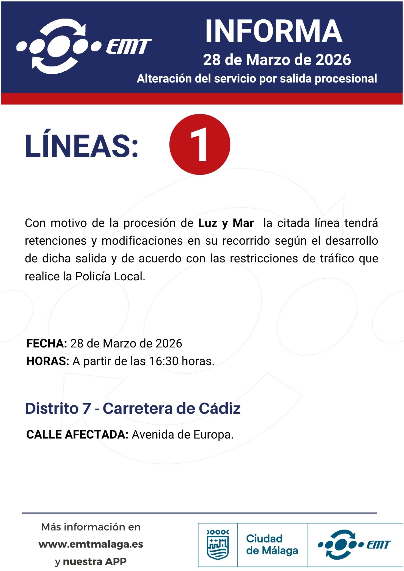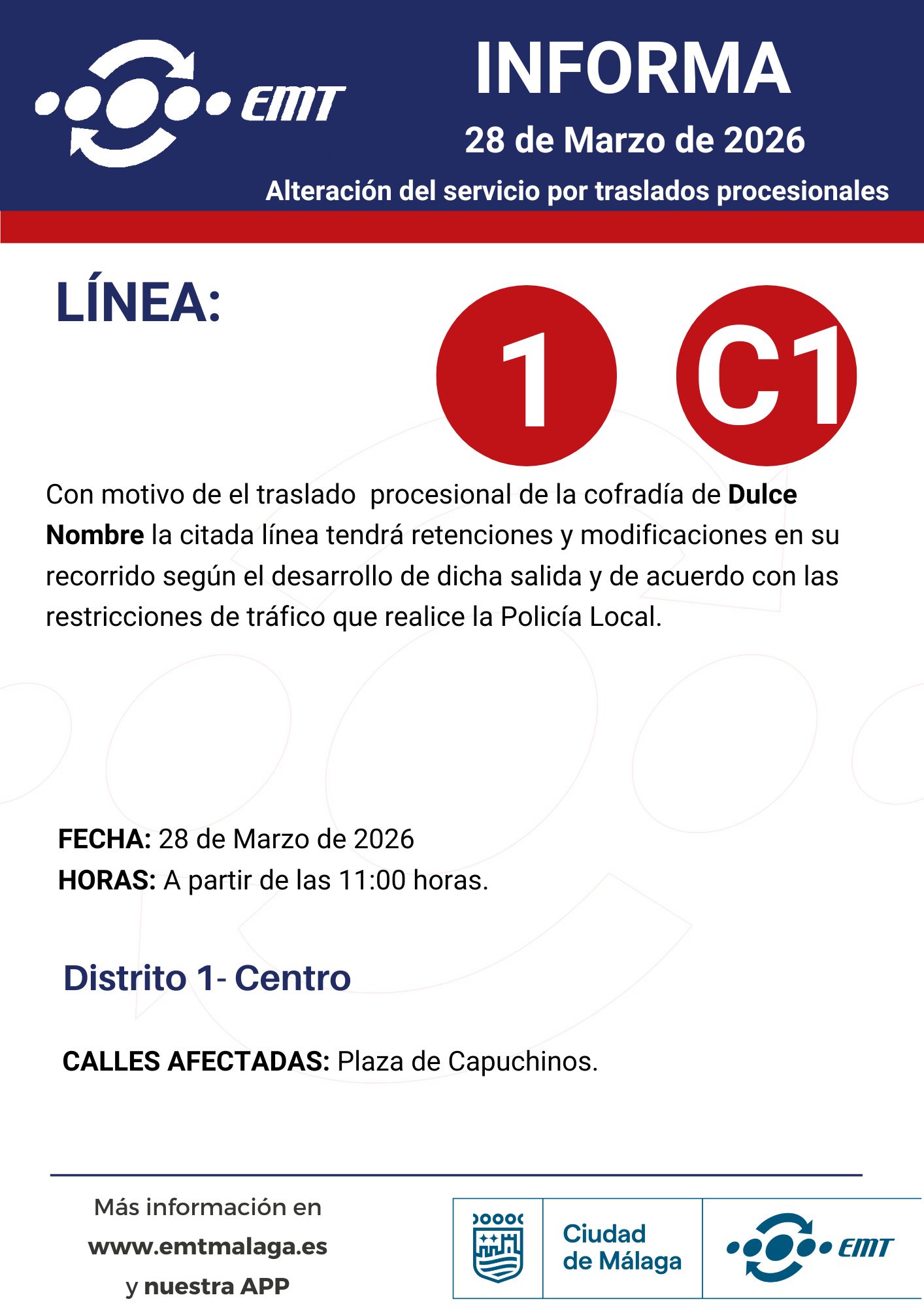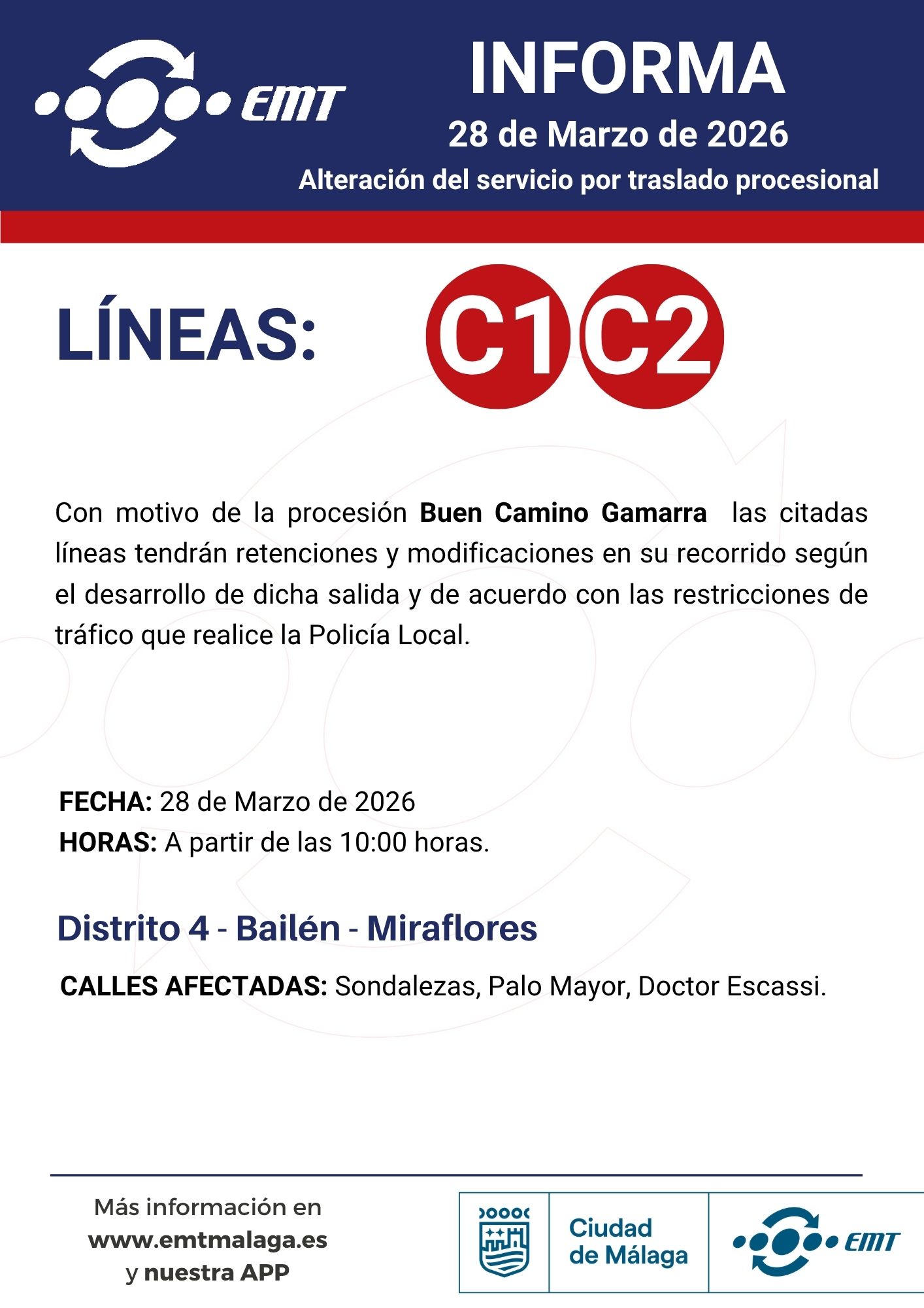 28 de marzo. Alteraciones en horarios y recorridos por traslados y procesiones 24/03/2026 EMT Alteraciones, Semana Santa, Uncategorized Por motivo de traslados y procesiones en diferentes barrios de Málaga, algunas de nuestras líneas podrán experimentar alteraciones en horarios y recorridos.