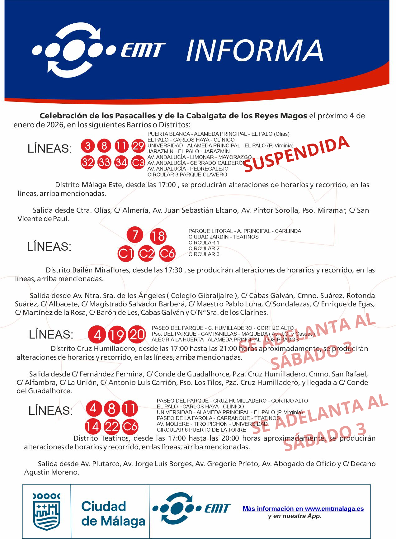 Con motivo de la Generali Maratón Málaga 2025, dado que el recorrido de la prueba afecta a gran número de calles de la ciudad, el servicio de determinadas líneas de los autobuses de la EMT se verá interrumpido y/o desviado desde las 20:00 horas del sábado y hasta las 17:00 horas del domingo.